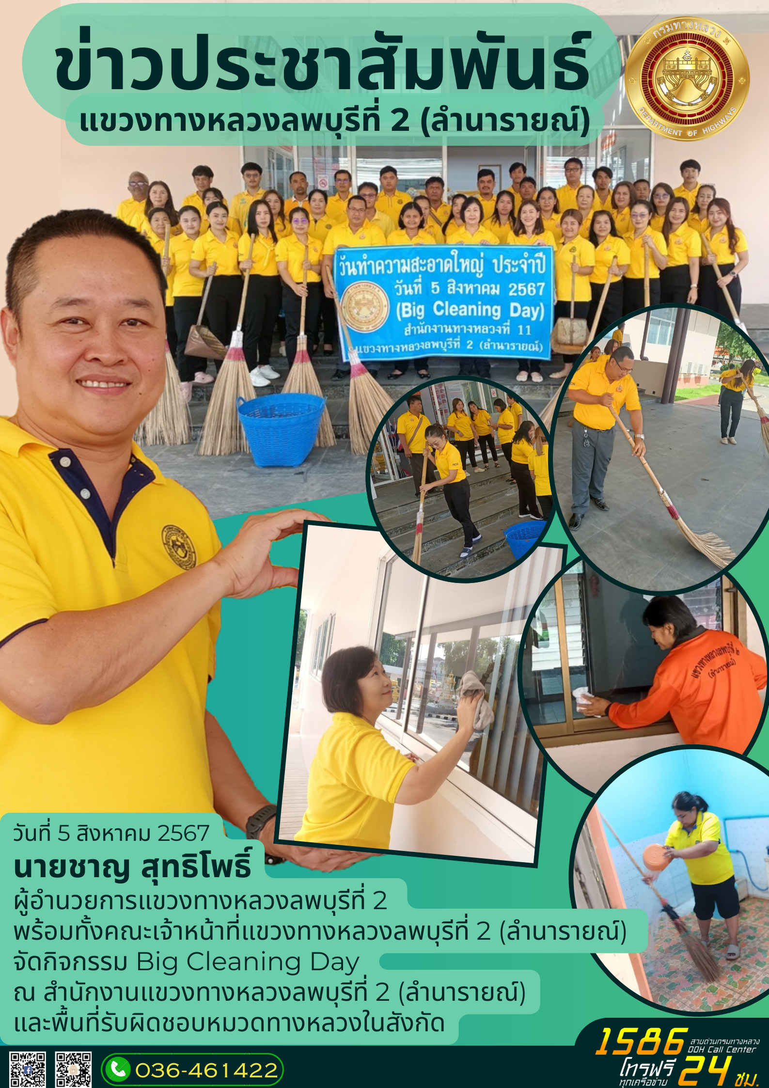 วันที่ 5 สิงหาคม 2567 เวลา 09.00 น. แขวงทางหลวงลพบุรีที่ 2 (ลำนารายณ์) จัดกิจกรรมวันทำความสะอาดใหญ่ (DOH Big Cleaning Day) ประจำปี พ.ศ. 2567 ตามแผนปฏิบัติการโครงการ 5 ส กรมทางหลวง ปีงบประมาณ พ.ศ. 2567 โดยมี นายชาญ สุทธิโพธิ์ ผู้อำนวยการแขวงทางหลวงลพบุรีที่ 2 (ลำนารายณ์) พร้อมด้วย ข้าราชการ และเจ้าหน้าที่ในสังกัด โดยร่วมกันทำความสะอาดทุกพื้นที่ในหน่วยงาน เพื่อเป็นการสร้างวัฒนธรรมการทำงานร่วมกัน สร้างความสัมพันธ์และส่งเสริมคุณภาพชีวิต รวมทั้งสภาพแวดล้อมที่ดีในการทำงาน