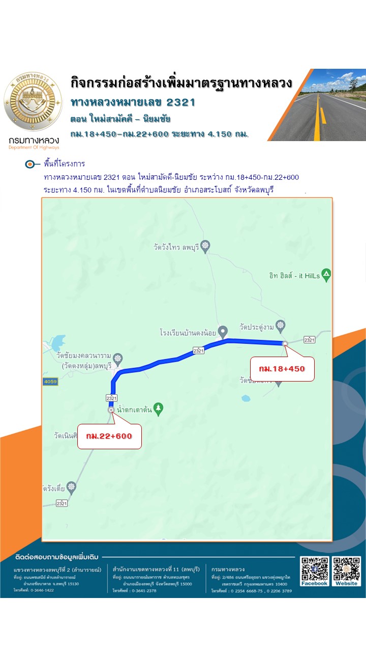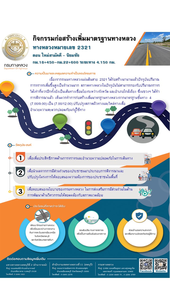ด้วยแขวงทางหลวงลพบุรีที่ 2 (ลำนารายณ์) กรมทางหลวง ได้รับจัดสรรงบประมาณปี 2568 กิจกรรมก่อสร้างเพิ่มมาตรฐานทางหลวง ทางหลวงหมายเลข 2321 ตอน ใหม่สามัคคี – นิยมชัย ระหว่าง กม.18+450 - กม.22+600 ระยะทาง 4.150 กม. โดยจะทำการปรับปรุงผิวทางและไหล่ทางจากมาตรฐานทางชั้น 7/(9) เป็นมาตรฐานทาง 7/(12) ซึ่งจะดำเนินการปรับปรุงผิวจราจรและขยายไหล่ทางจากความกว้างเดิม 1.00 ม.เป็นความกว้าง 2.50 ม. พร้อมติดตั้งอุปกรณ์อำนวยความปลอดภัย เพื่อเพิ่มประสิทธิภาพในการรองรับประมาณจราจรที่เพิ่มมากขึ้น และเพื่ออำนวยความสะดวกปลอดภัยแก่ผู้ใช้ทางหลวง