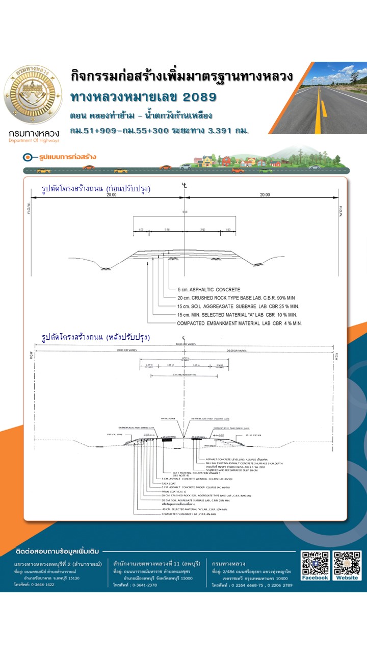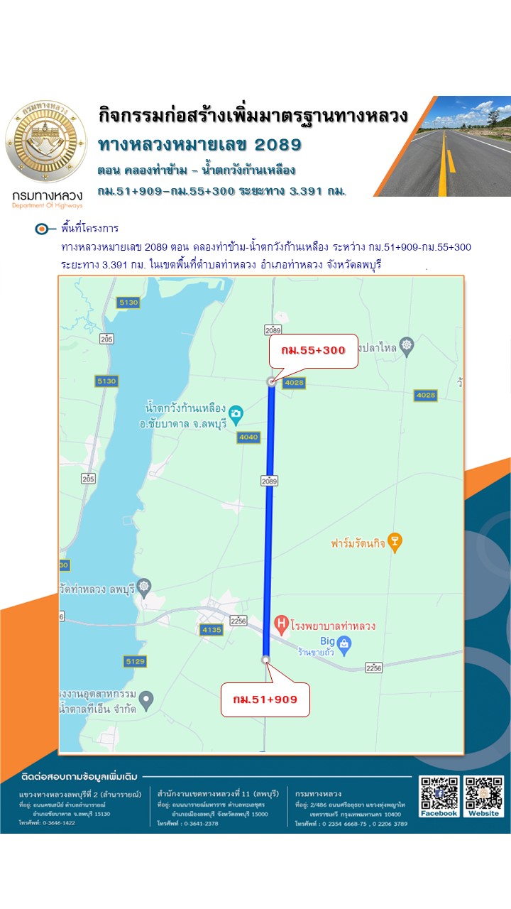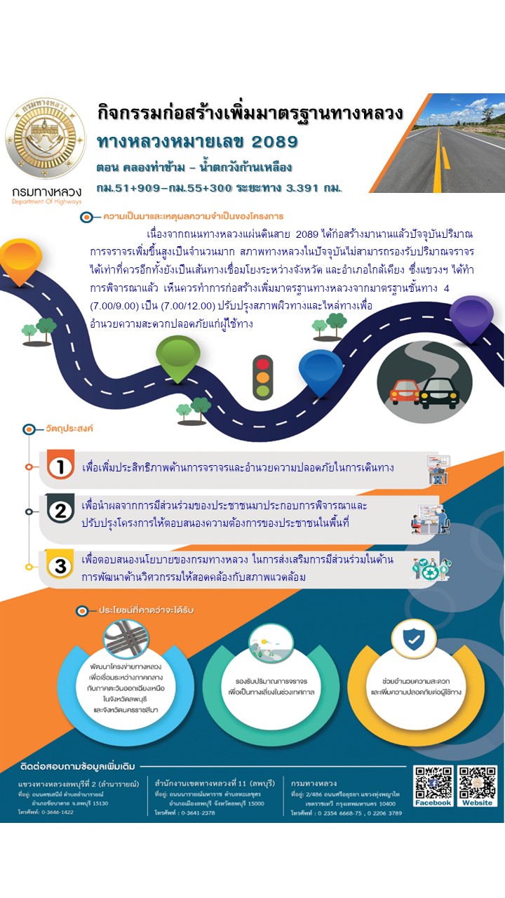 ด้วยแขวงทางหลวงลพบุรีที่ 2 (ลำนารายณ์) กรมทางหลวง ได้รับจัดสรรงบประมาณปี 2568 กิจกรรมก่อสร้างเพิ่มมาตรฐานทางหลวง ทางหลวงหมายเลข 2089 ตอน คลองท่าข้าม - น้ำตกวังก้านเหลือง ระหว่าง กม.51+900 - กม.55+300 ระยะทาง 3.391 กม. โดยจะทำการปรับปรุงผิวทางและไหล่ทางจากมาตรฐานทางชั้น 7/(9) เป็นมาตรฐานทาง 7/(12) ซึ่งจะดำเนินการปรับปรุงผิวจราจรและขยายไหล่ทางจากความกว้างเดิม 1.00 ม.เป็นความกว้าง 2.50 ม. พร้อมติดตั้งอุปกรณ์อำนวยความปลอดภัย เพื่อเพิ่มประสิทธิภาพในการรองรับประมาณจราจรที่เพิ่มมากขึ้น และเพื่ออำนวยความสะดวกปลอดภัยแก่ผู้ใช้ทางหลวง