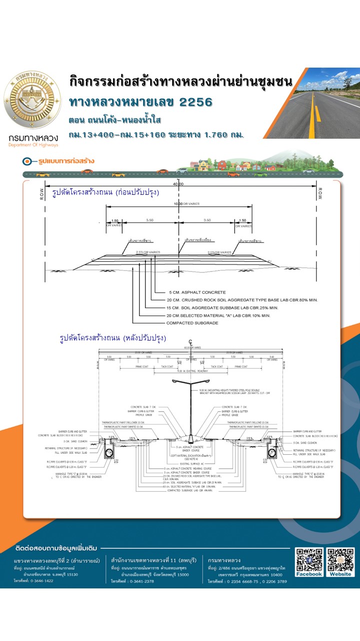 ด้วยแขวงทางหลวงลพบุรีที่ 2 (ลำนารายณ์) กรมทางหลวง ได้รับจัดสรรงบประมาณปี 2568 โครงการก่อสร้างโครงข่ายทางหลวงแผ่นดิน กิจกรรมก่อสร้างทางหลวงผ่านชุมชนเพื่อคนทุกกลุ่ม งานพัฒนาทางหลวงผ่านย่านชุมชน ทางหลวงหมายเลข 2256 ตอน ถนนโค้ง – หนองน้ำใส ระหว่าง กม.13+400 - กม.15+160 ระยะทาง 1.760 กม. เพื่อรองรับปริมาณจราจรที่เพิ่มสูงขึ้น จึงทำการก่อสร้างทางหลวงผ่านย่านชุมชนเป็นการขยายช่องจราจร จาก 2 ช่องจราจร เป็น 4 ช่องจราจร ที่มีมารตฐานสูงขึ้นพร้อมติดตั้งอุปกรณ์อำนวยความปลอดภัย