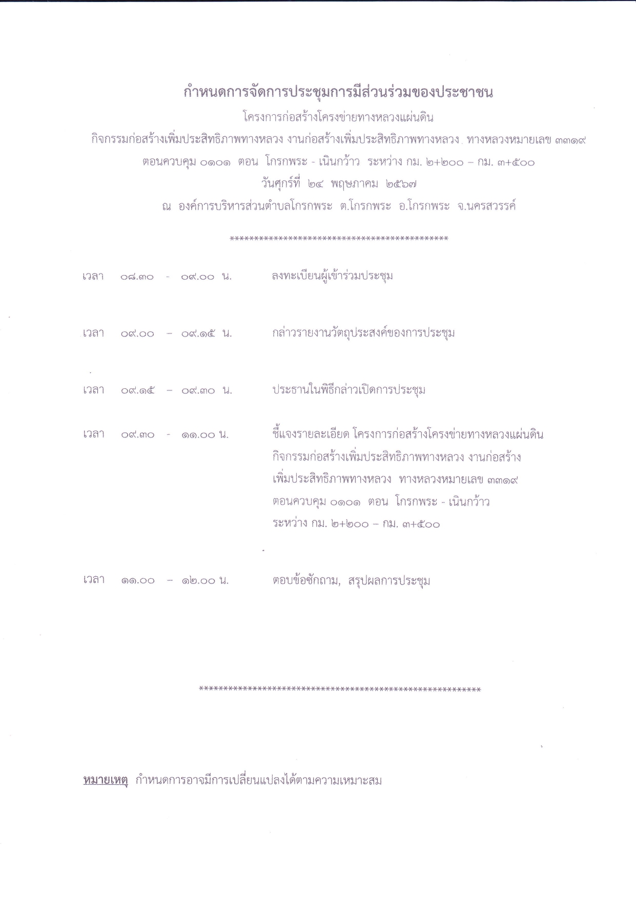การประชุมการมีส่วนร่วมของประชาชน โครงการก่อสร้างโครงข่ายทางหลวงแผ่นดิน กิจกรรมก่อสร้างเพิ่มประสิทธิภาพทางหลวง งานก่อสร้างเพิ่มประสิทธิภาพทางหลวง ทางหลวงหมายเลข 3319 ตอนควบคุม 0101 ตอน โกรกพระ – เนินกว้าว ระหว่าง กม. 2+200 - กม. 3+500
