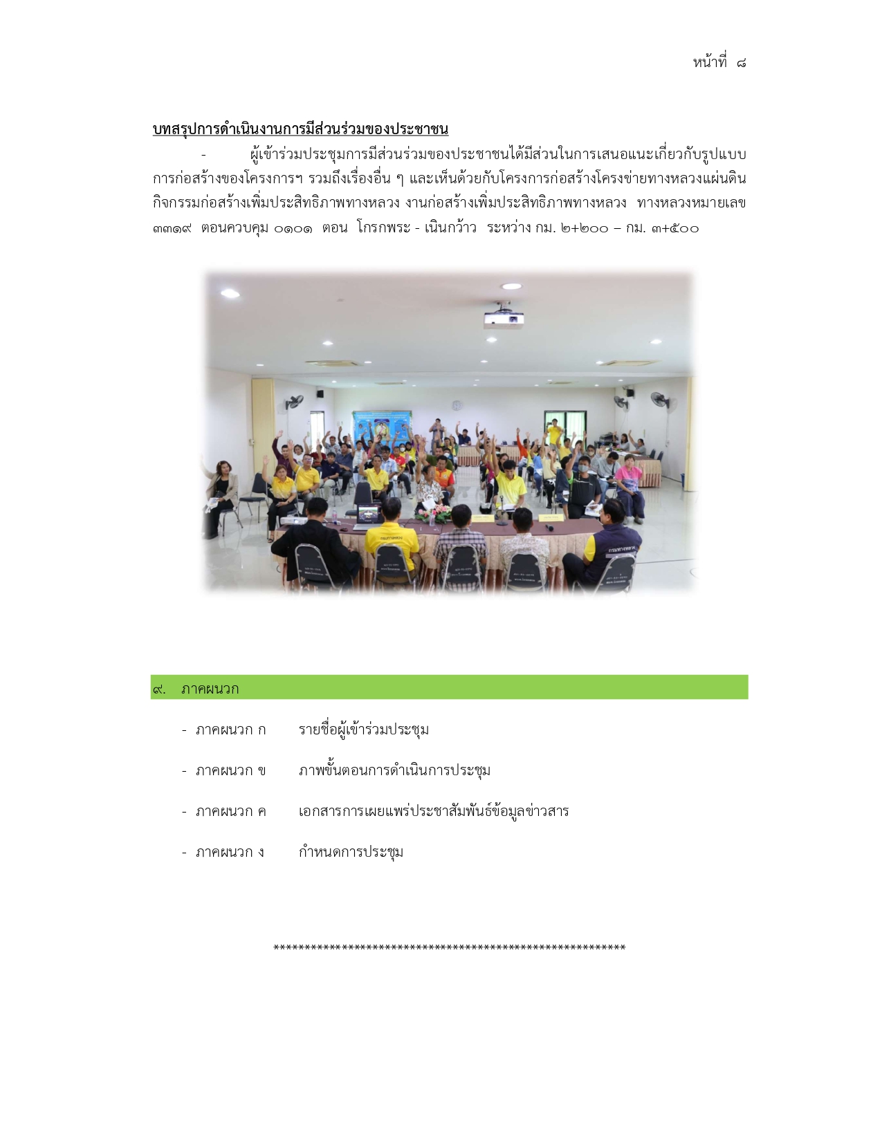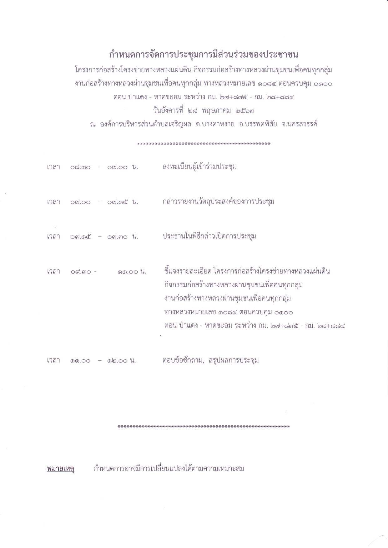 การประชุมการมีส่วนร่วมของประชาชน โครงการก่อสร้างโครงข่ายทางหลวงแผ่นดิน กิจกรรมก่อสร้างทางหลวงผ่านชุมชนเพื่อคนทุกกลุ่ม งานก่อสร้างทางหลวงผ่านชุมชุนเพื่อคนทุกกลุ่ม ทางหลวงหมายเลข 1084 ตอนควบคุม 0100 ตอน ป่าแดง - หาดชะอม ระหว่าง กม. 27+875 - กม. 28+884