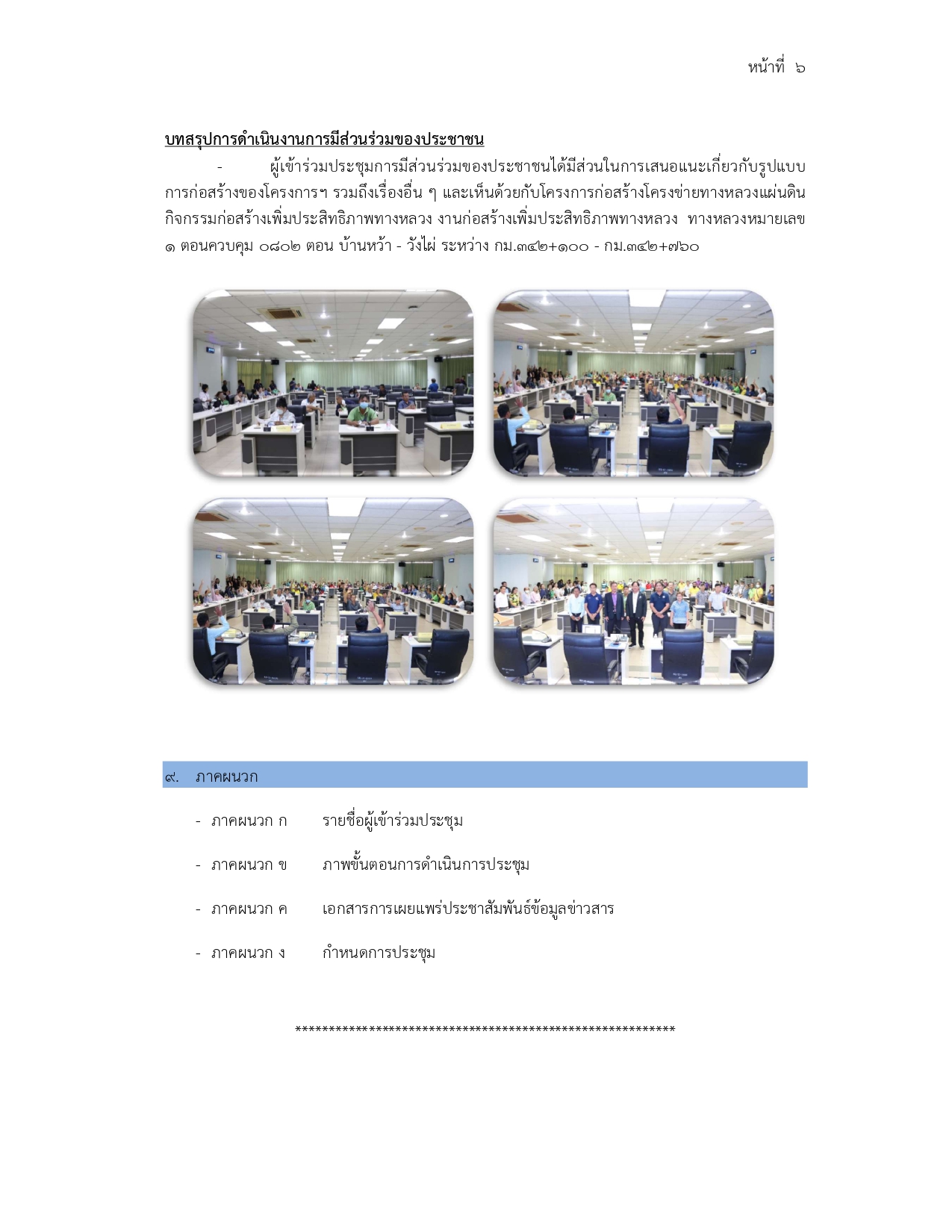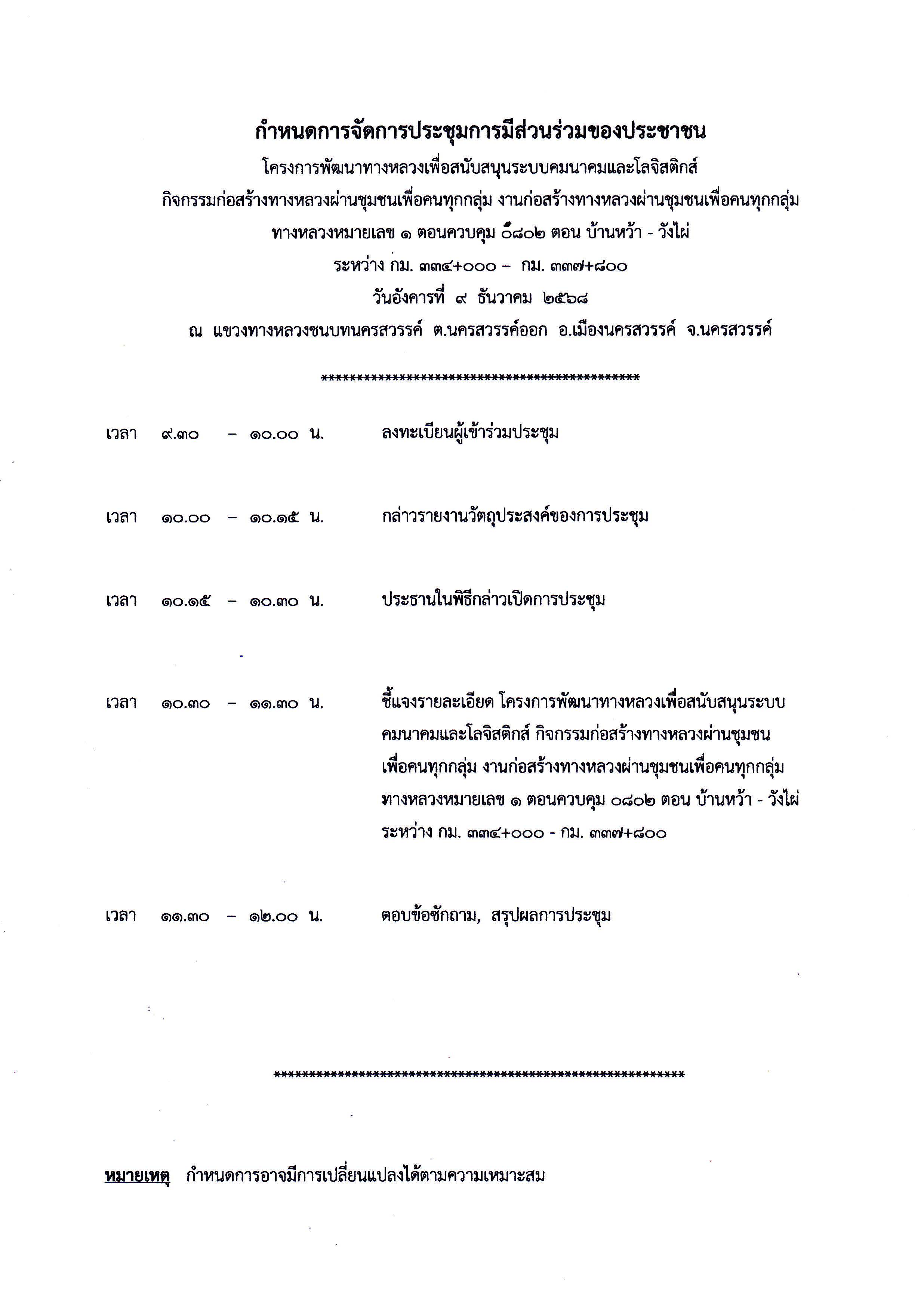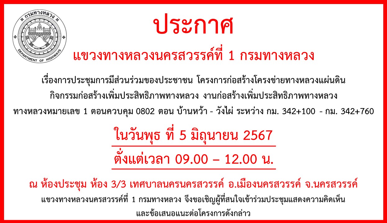 การประชุมการมีส่วนร่วมของประชาชน โครงการก่อสร้างโครงข่ายทางหลวงแผ่นดิน กิจกรรมก่อสร้างเพิ่มประสิทธิภาพทางหลวง งานก่อสร้างเพิ่มประสิทธิภาพทางหลวง ทางหลวงหมายเลข 1 ตอนควบคุม 0802 ตอน บ้านหว้า - วังไผ่ ระหว่าง กม. 342+100 - กม. 342+760