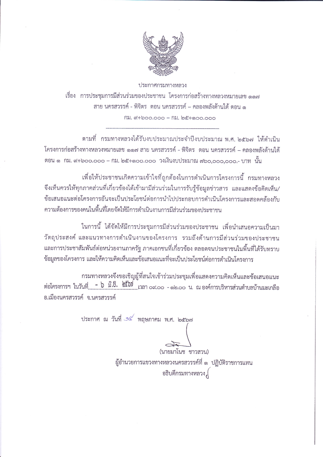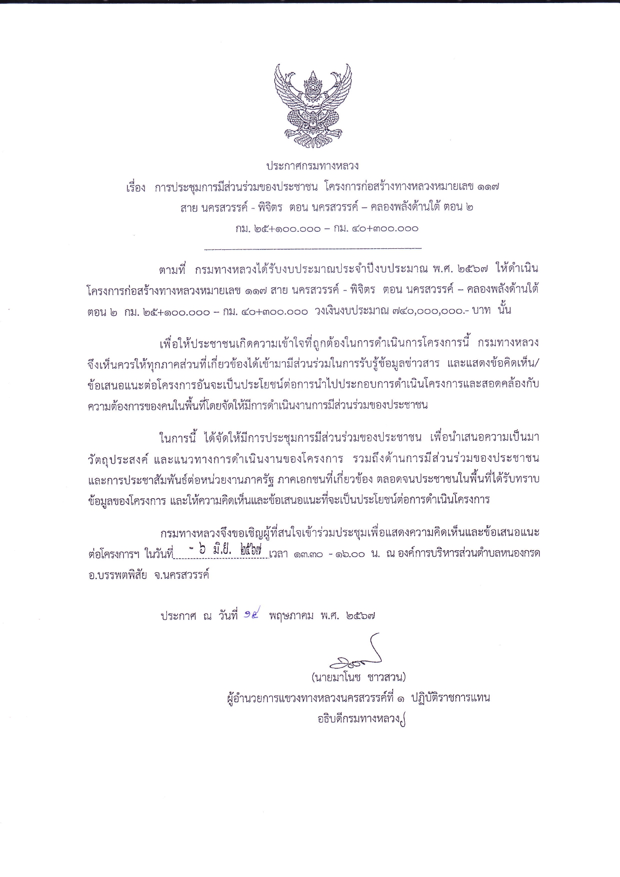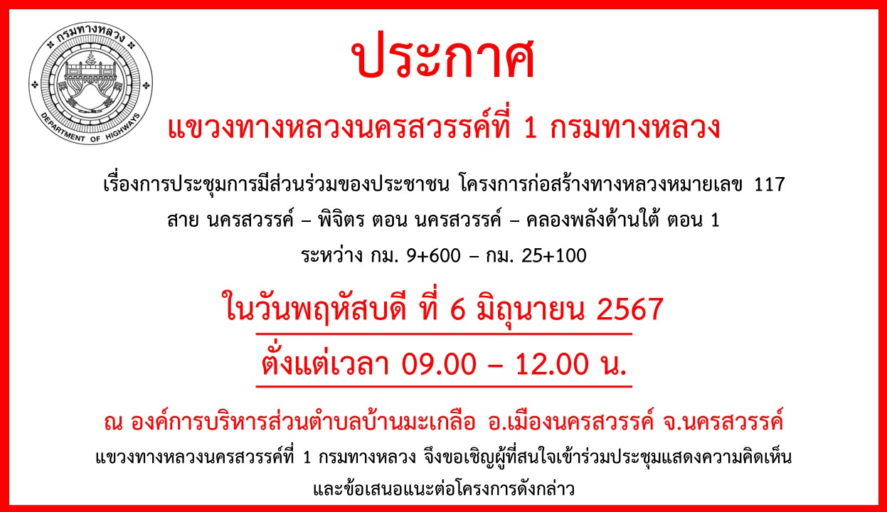 การประชุมการมีส่วนร่วมของประชาชน โครงการก่อสร้างทางหลวงหมายเลข 117 สาย นครสวรรค์ – พิจิตร ตอน นครสวรรค์ – คลองพลังด้านใต้ ตอน 1 ระหว่าง กม. 9+600 – กม. 25+100