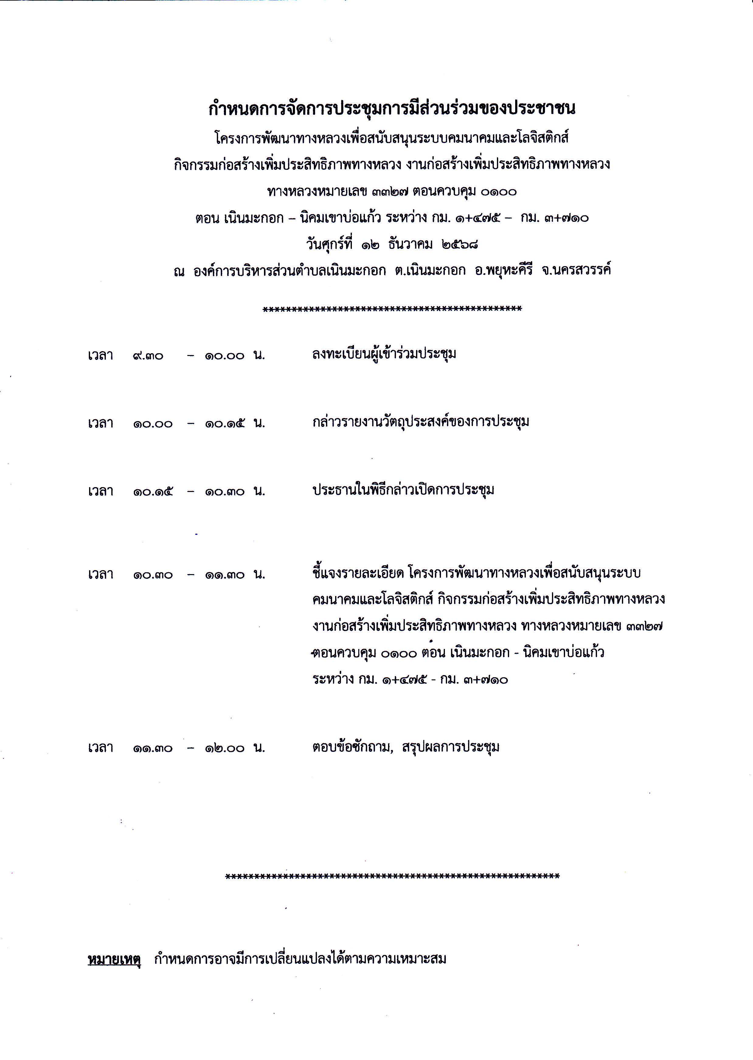 การประชุมการมีส่วนร่วมของประชาชน โครงการพัฒนาทางหลวงเพื่อสนับสนุนระบบคมนาคมและโลจิสติกส์ กิจกรรมก่อสร้างเพิ่มประสิทธิภาพทางหลวง งานก่อสร้างเพิ่มประสิทธิภาพทางหลวง ทางหลวงหมายเลข 3327 ตอนควบคุม 0100 ตอน เนินมะกอก - นิคมเขาบ่อแก้ว ระหว่าง กม. 1+475 - กม. 3+710