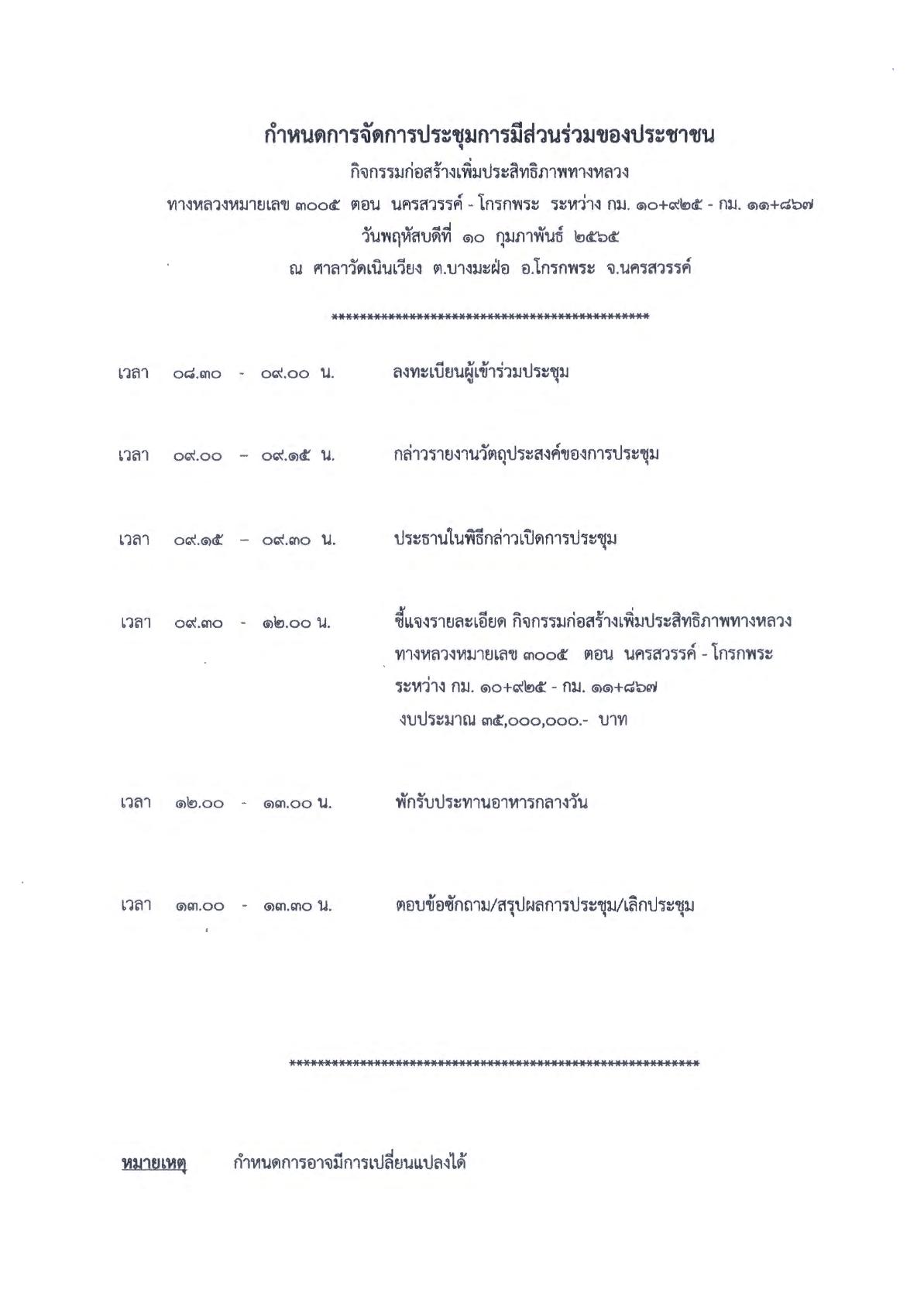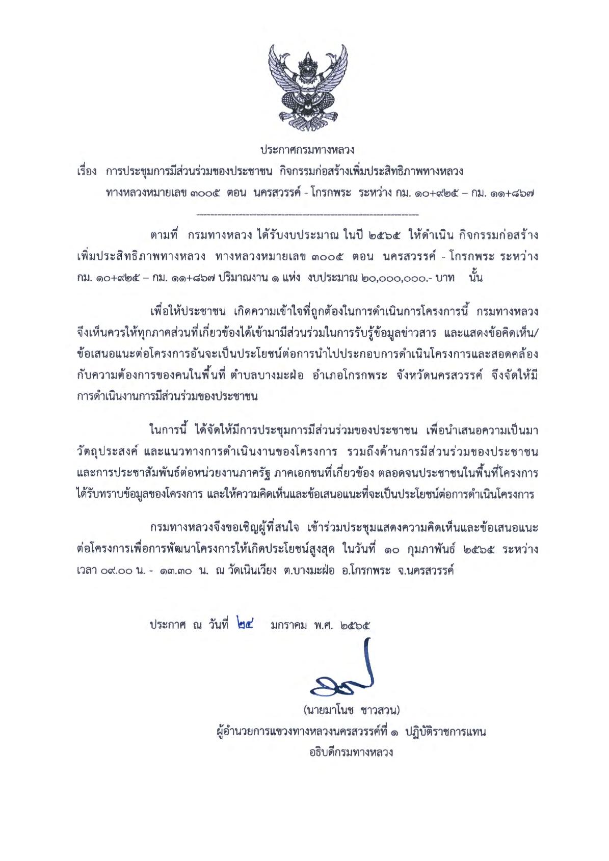 ประกาศแขวงทางหลวงนครสวรรค์ที่ 1 การประชุมการมีส่วนร่วมของประชาชน วันที่ 10 กุมภาพันธ์ 2565