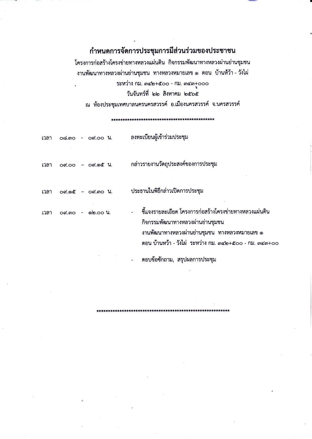 ประกาศแขวงทางหลวงนครสวรรค์ที่ 1 การประชุมการมีส่วนร่วมของประชาชน วันที่ 22 สิงหาคม 2565