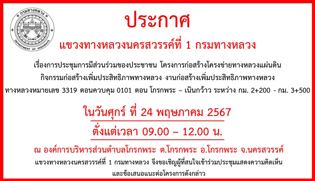 ข้อมูลข่าว : การประชุมการมีส่วนร่วมของประชาชน โครงการก่อสร้างโครงข่ายทางหลวงแผ่นดิน กิจกรรมก่อสร้างเพิ่มประสิทธิภาพทางหลวง งานก่อสร้างเพิ่มประสิทธิภาพทางหลวง ทางหลวงหมายเลข 3319 ตอนควบคุม 0101 ตอน โกรกพระ – เนินกว้าว ระหว่าง กม. 2+200 - กม. 3+500