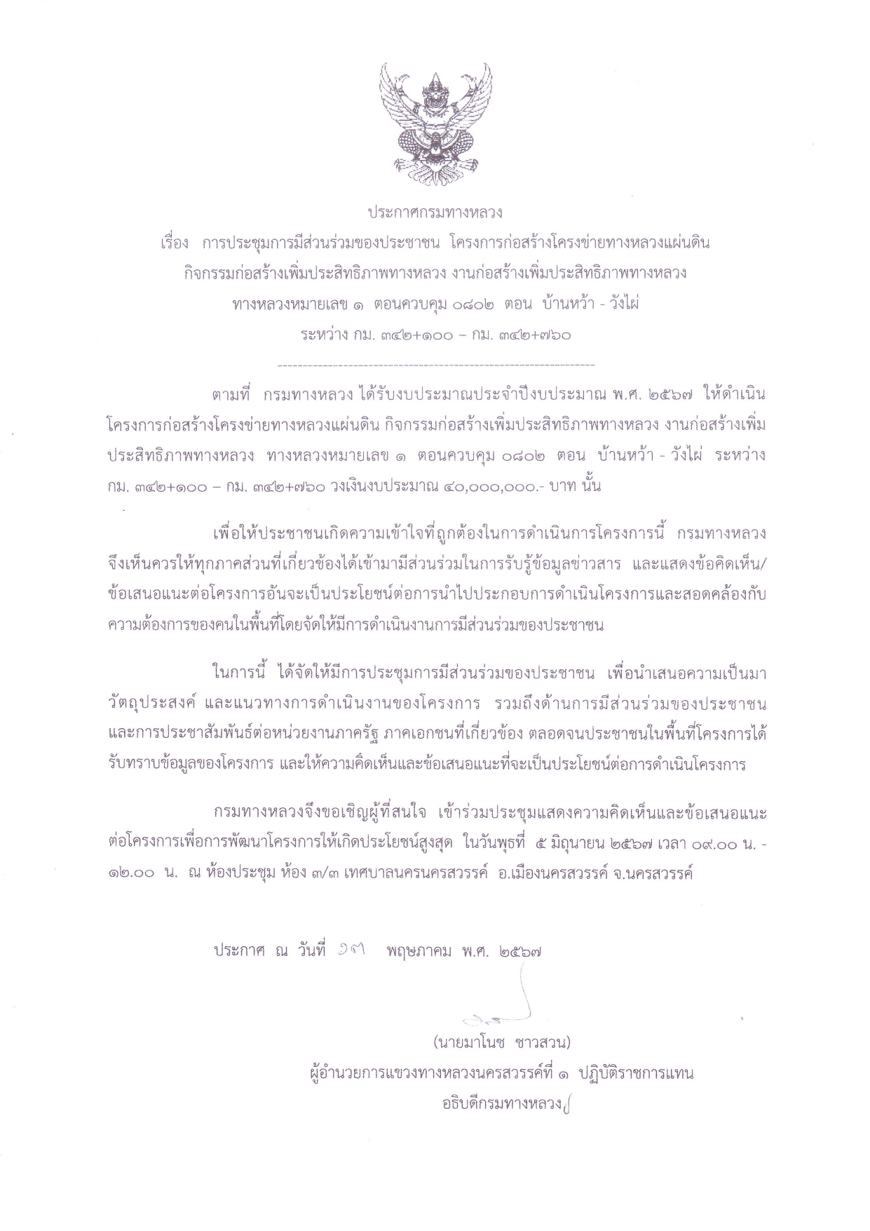 ข้อมูลข่าว : การประชุมการมีส่วนร่วมของประชาชน โครงการก่อสร้างโครงข่ายทางหลวงแผ่นดิน กิจกรรมก่อสร้างเพิ่มประสิทธิภาพทางหลวง งานก่อสร้างเพิ่มประสิทธิภาพทางหลวง ทางหลวงหมายเลข 1 ตอนควบคุม 0802 ตอน บ้านหว้า - วังไผ่ ระหว่าง กม. 342+100 - กม. 342+760