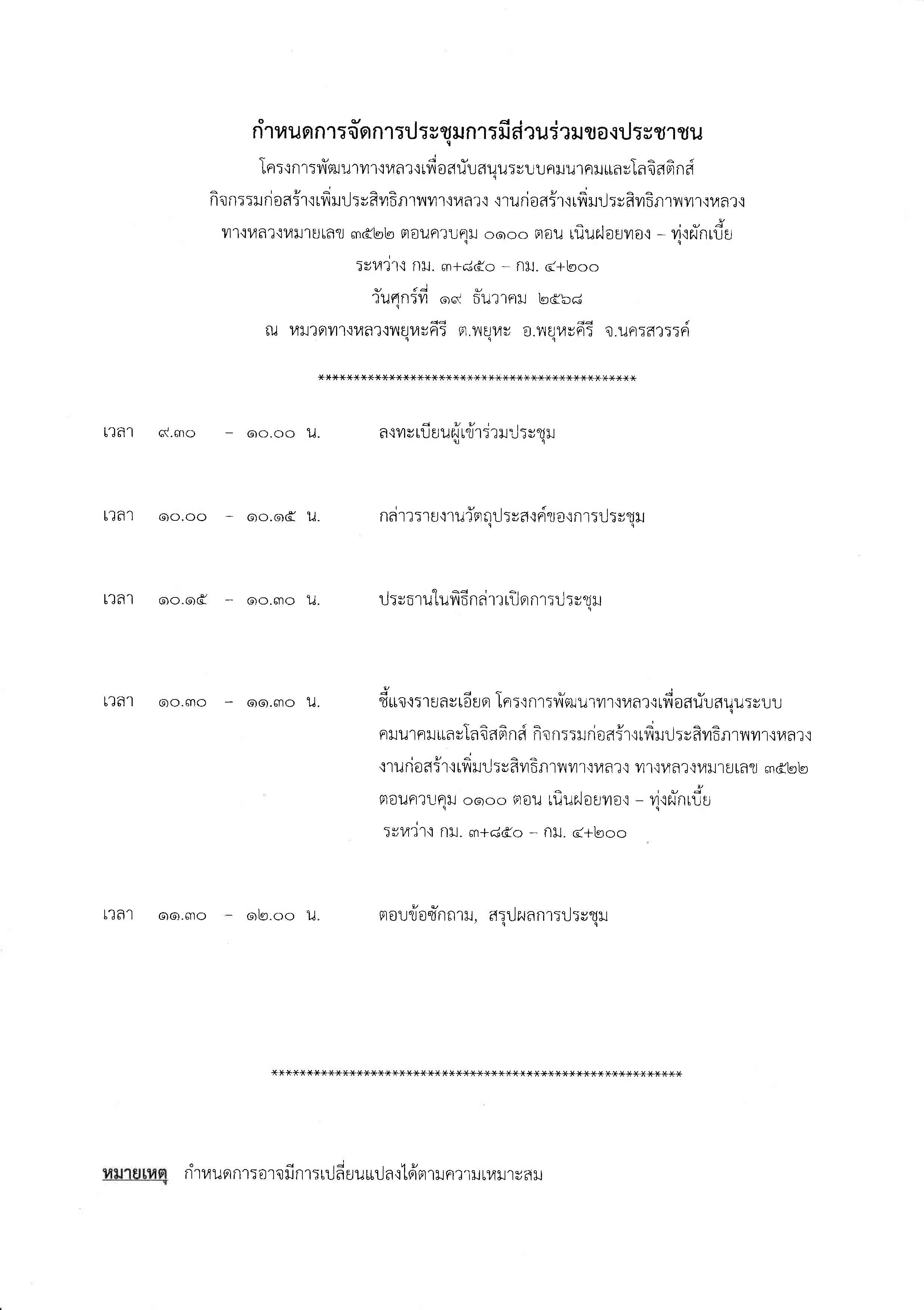 การประชุมการมีส่วนร่วมของประชาชน โครงการพัฒนาทางหลวงเพื่อสนับสนุนระบบคมนาคมและโลจิสติกส์ กิจกรรมก่อสร้างเพิ่มประสิทธิภาพทางหลวง งานก่อสร้างเพิ่มประสิทธิภาพทางหลวง ทางหลวงหมายเลข 3522 ตอนควบคุม 0100 ตอน เนินฝอยทอง – ทุ่งผักเบี้ย ระหว่าง กม. 3+850 – กม. 4+200