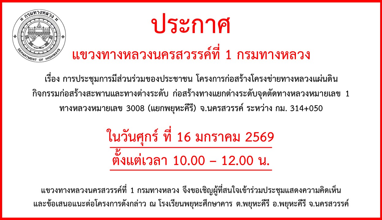 การประชุมการมีส่วนร่วมของประชาชน โครงการก่อสร้างโครงข่ายทางหลวงแผ่นดิน กิจกรรมก่อสร้างสะพานและทางต่างระดับ ก่อสร้างทางแยกต่างระดับจุดตัดทางหลวงหมายเลข 1 ตัดทางหลวงหมายเลข 3008 (แยกพยุหะคีรี) จ.นครสวรรค์ ที่ กม.314+050