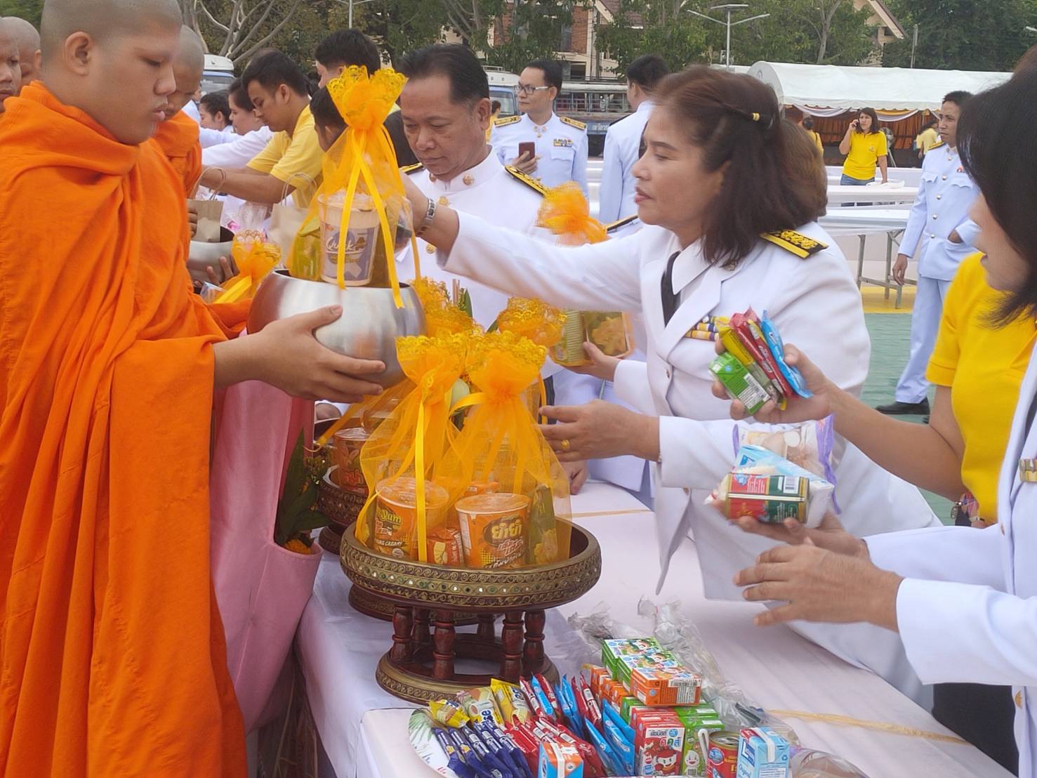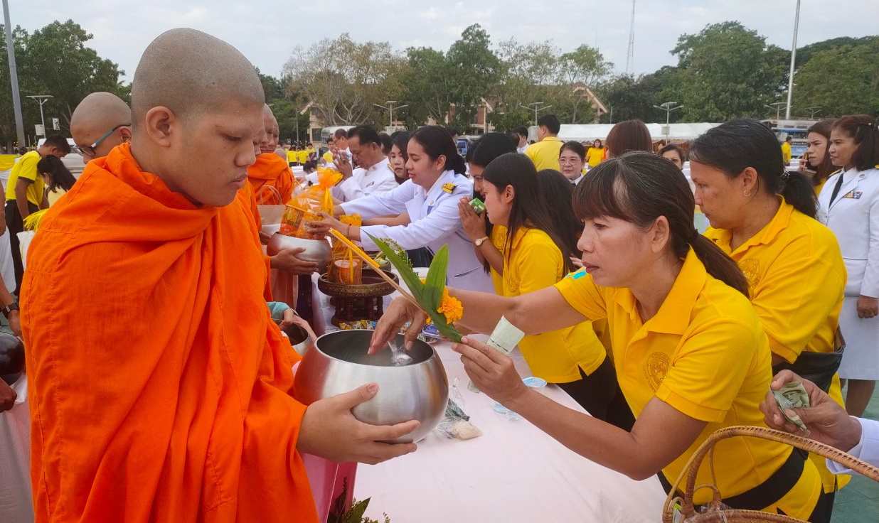 ร่วมพิธีทำบุญตักบาตรข้าวสารอาหารแห้งและพิธีวางพวงมาลา