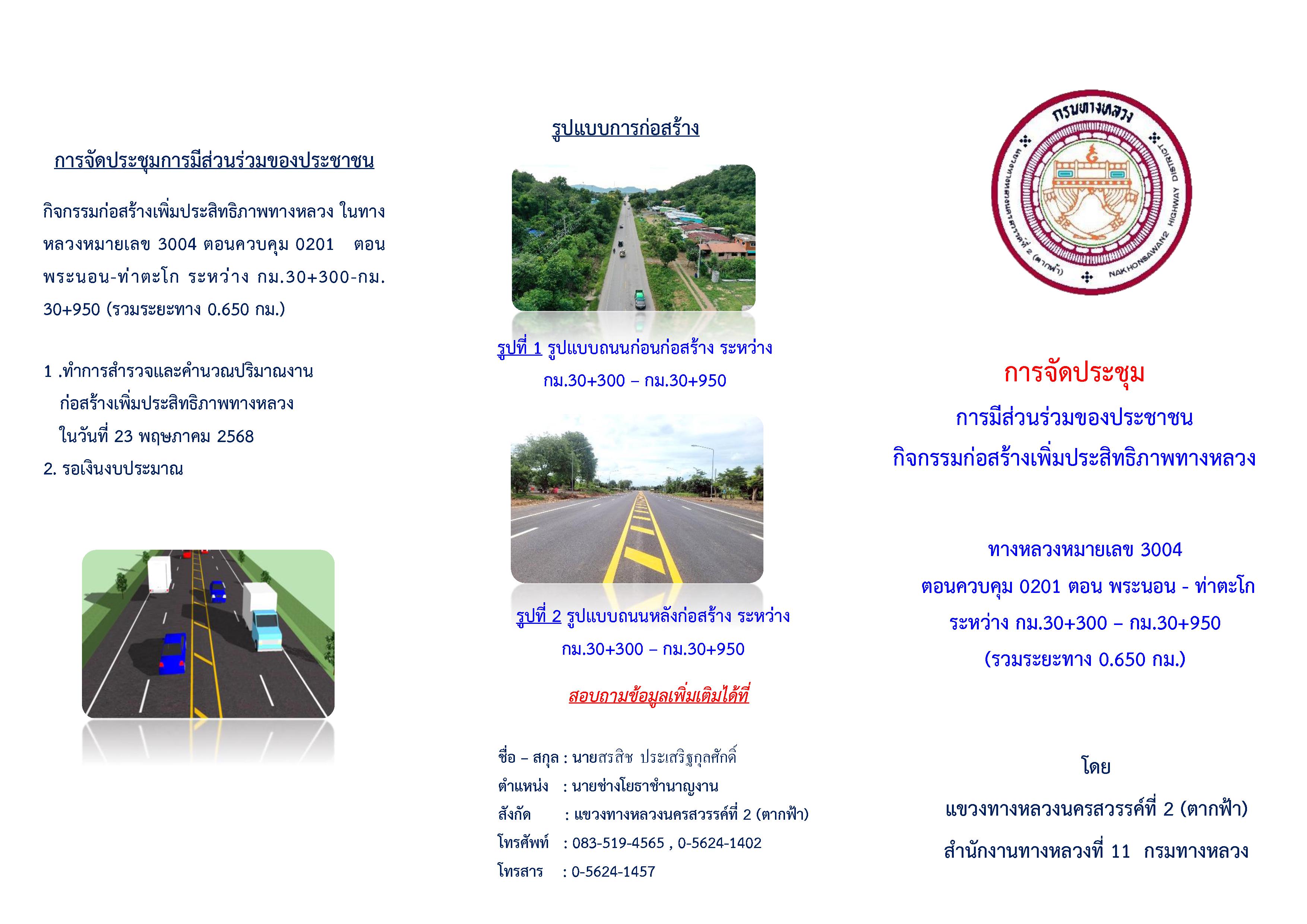 ขอเชิญชวนชาว อ.ท่าตะโก , อ.เมือง ,อ.ไพศาลี และ อ.ตากฟ้า จังหวัดนครสวรรค์และผู้สนใจ ร่วมรับฟังข้อมูลและแสดงความคิดเห็น กรมทางหลวง จะดำเนินการก่อสร้างเพิ่มประสิทธิภาพทางหลวง