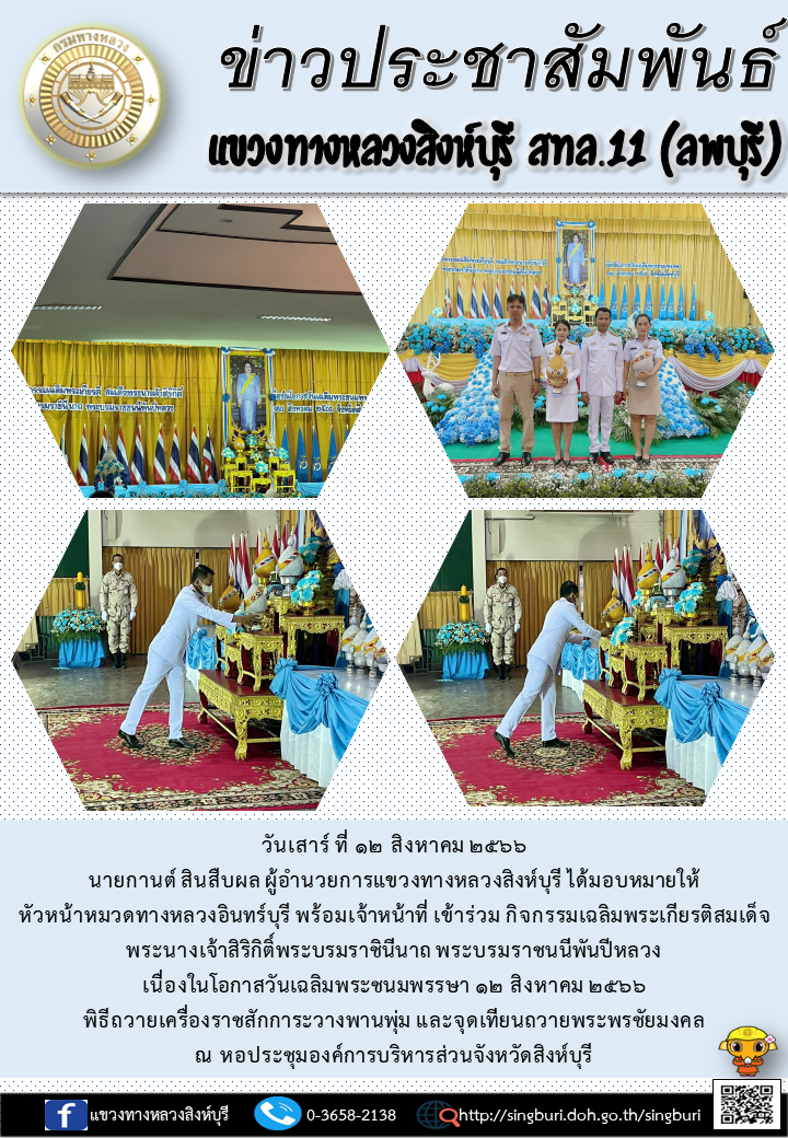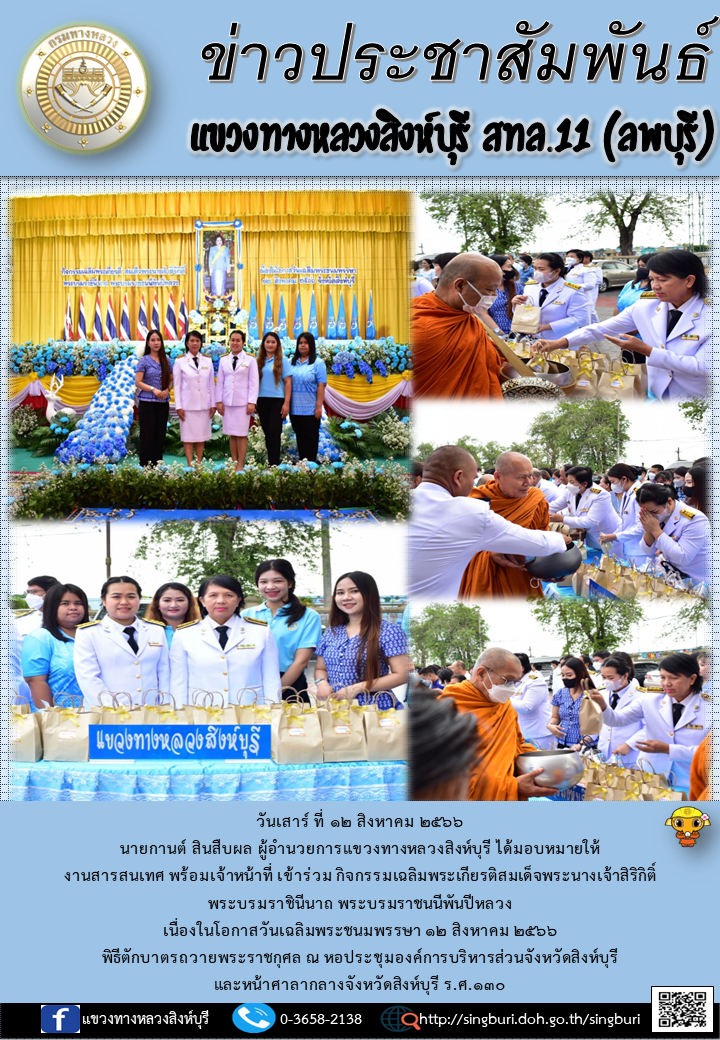 แขวงทางหลวงสิงห์บุรี โดย นายกานต์ สินสืบผล ผู้อำนวยการแขวงทางหลวงสิงห์บุรี ได้มอบหมายให้ งานสารสนเทศ เข้าร่วมกิจกรรมเฉลิมพระเกียรติสมเด็จพระนางเจ้าสิริกิติ์พระบรมราชินีนาถ พระบรมราชนนีพันปีหลวง เนื่องในโอกาสวันเฉลิมพระชนมพรรษา ๑๒ สิงหาคม ๒๕๖๖ พิธีตักบาตรถวายพระราชกุศล ณ หอประชุม องค์การบริหารส่วนจังหวัดสิงห์บุรีและหน้าศาลากลางจังหวัดสิงห์บุรี ร.ศ.๑๓๐ ถนนวิไลจิตต์ อำเภอเมืองสิงห์บุรี จังหวัดสิงห์บุรี