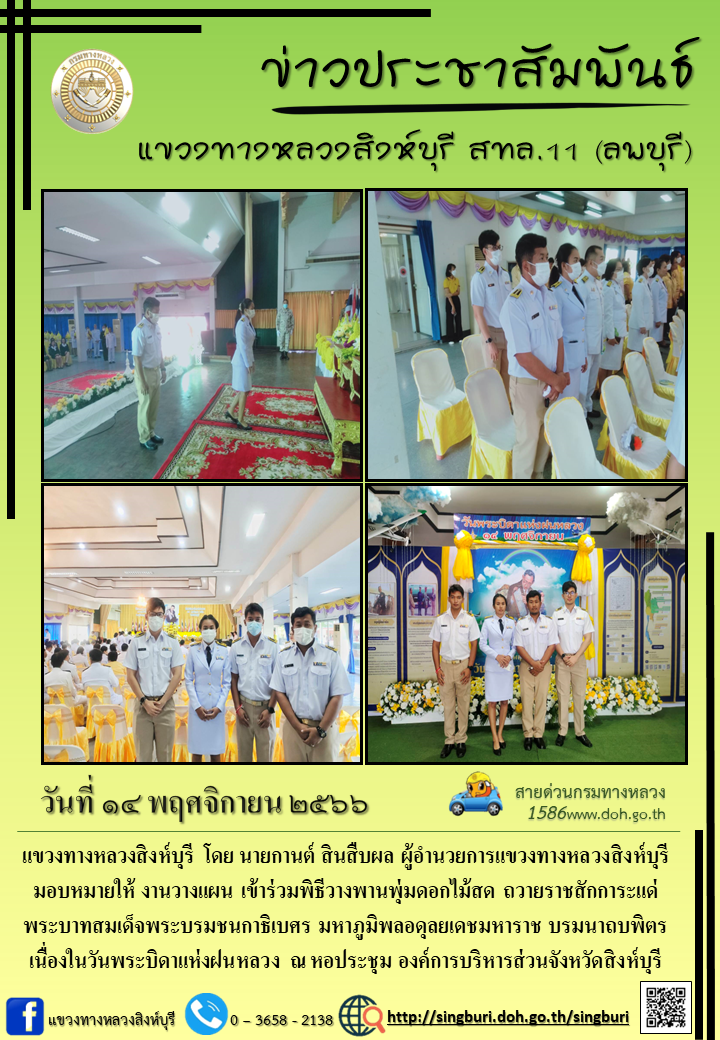 แขวงทางหลวงสิงห์บุรี โดยนายกานต์ สินสืบผล ผู้อำนวยการแขวงทางหลวง มอบหมายให้หน่วยงานวางแผน เข้าร่วมพิธีวางพานพุ่มดอกไม้สด ถวายราชสักการะแด่พระบาทสมเด็จพระบรมชนกาธิเบศร มหาภูมิพลอดุลยเดชมหาราช บรมนาถบพิตร เนื่องในวันพระบิดาแห่งฝนหลวง ๑๔ พฤศจิกายน ๒๕๖๖ ณ หอประชุม อบจ.สิงห์บุรี จังหวัดสิงห์บุรี