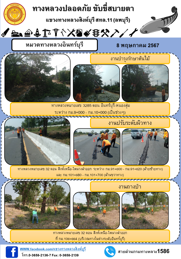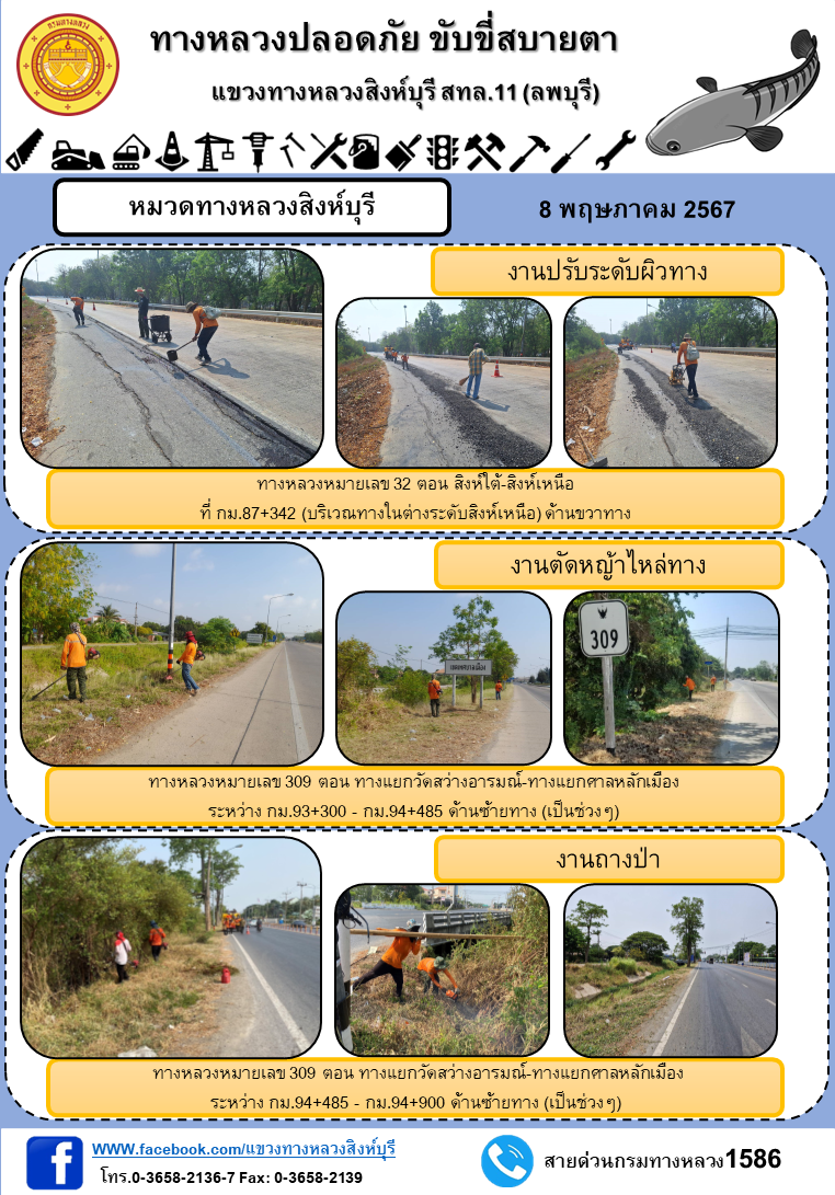 ผลการปฏิบัติงาน ตั้งแต่วันที่ 30 เมษายน - 3 พฤษภาคม 2567 แขวงทางหลวงสิงห์บุรี