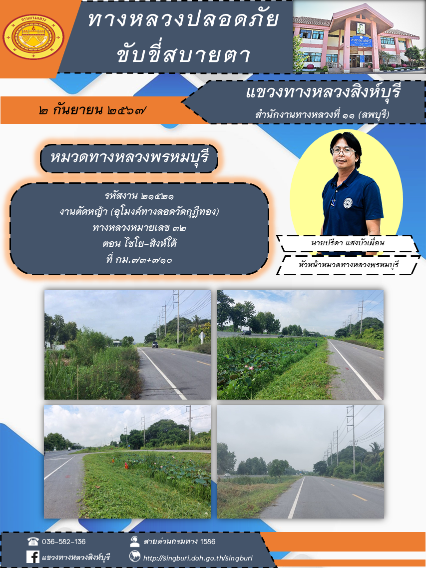 ข้อมูลภาพกิจกรรม : ??ประชาสัมพันธ์ วันจันทร์ที่ 2 กันยายน 2567 ผลการปฏิบัติงาน ตั้งแต่วันที่ 26-30 สิงหาคม 2567 แขวงทางหลวงสิงห์บุรี
