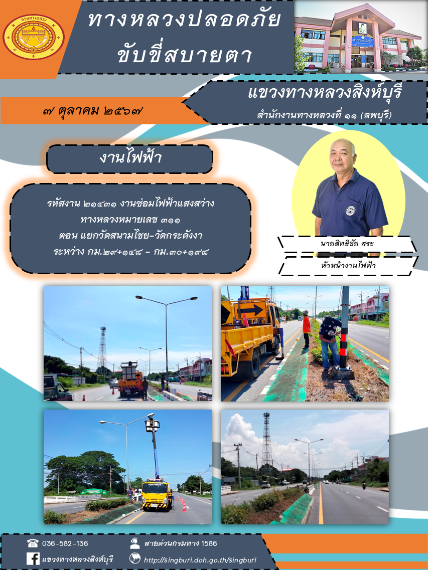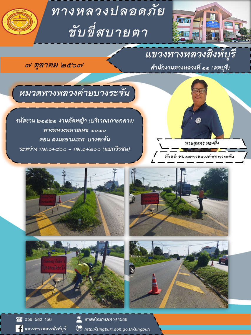 ข้อมูลภาพกิจกรรม : ผลการปฏิบัติงาน ตั้งแต่วันที่ 30 กันยายน ถึง 4 ตุลาคม2567 แขวงทางหลวงสิงห์บุรี