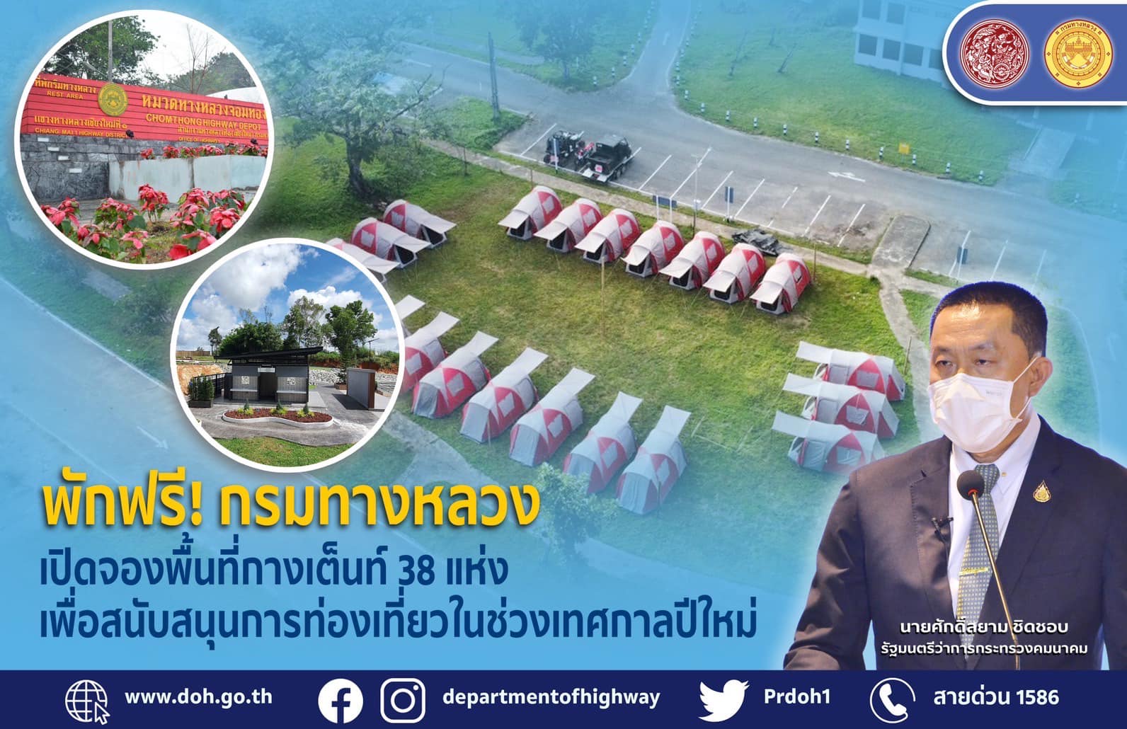 ข้อมูลข่าว : รับลมหนาวฟรี! กรมทางหลวง เปิดจองพื้นที่กางเต็นท์ทั่วประเทศ 38 แห่ง เพื่อสนับสนุนการท่องเที่ยวในช่วงฤดูหนาวและเทศกาลปีใหม่ สอบถามโทร 1586
